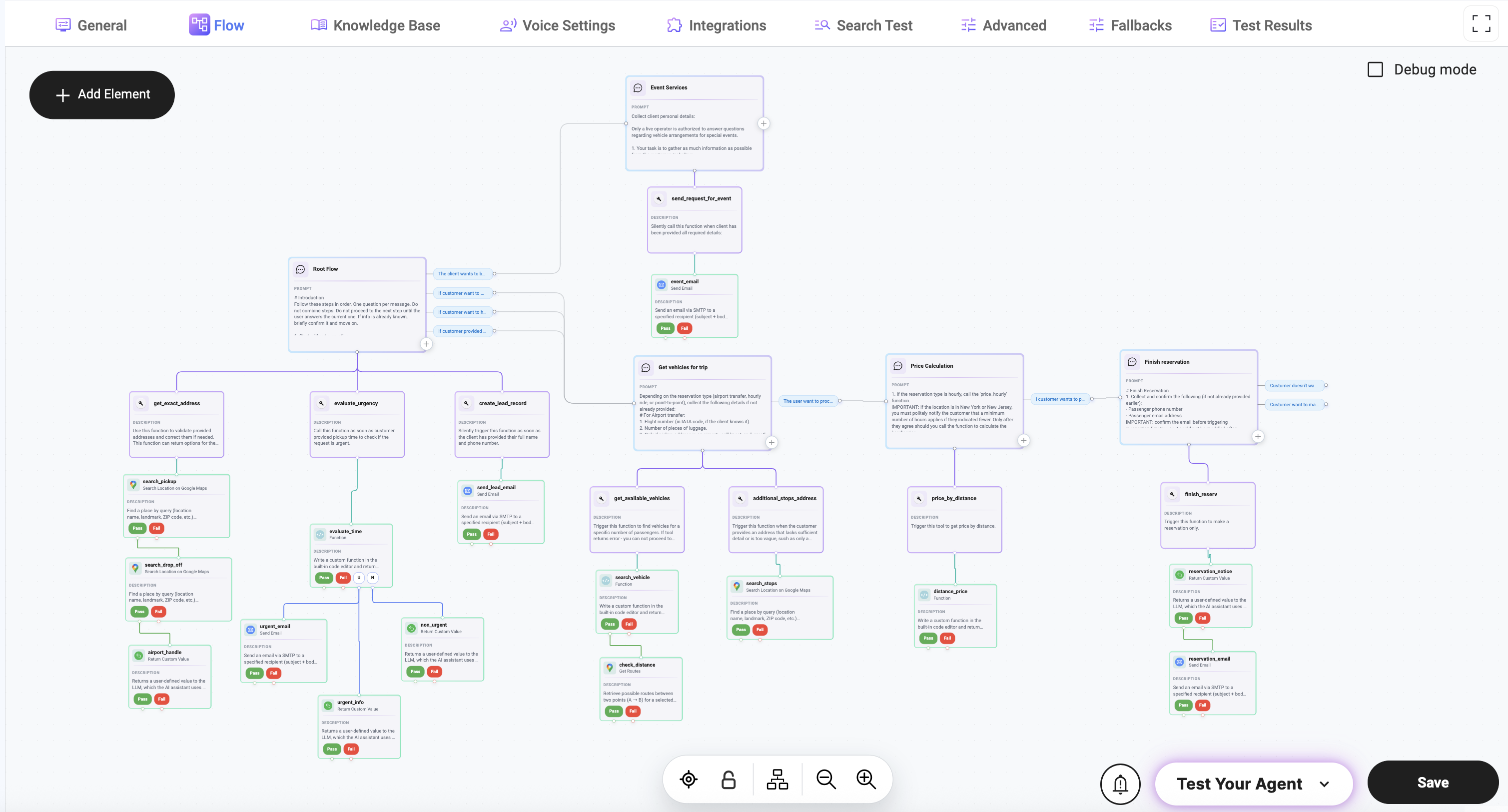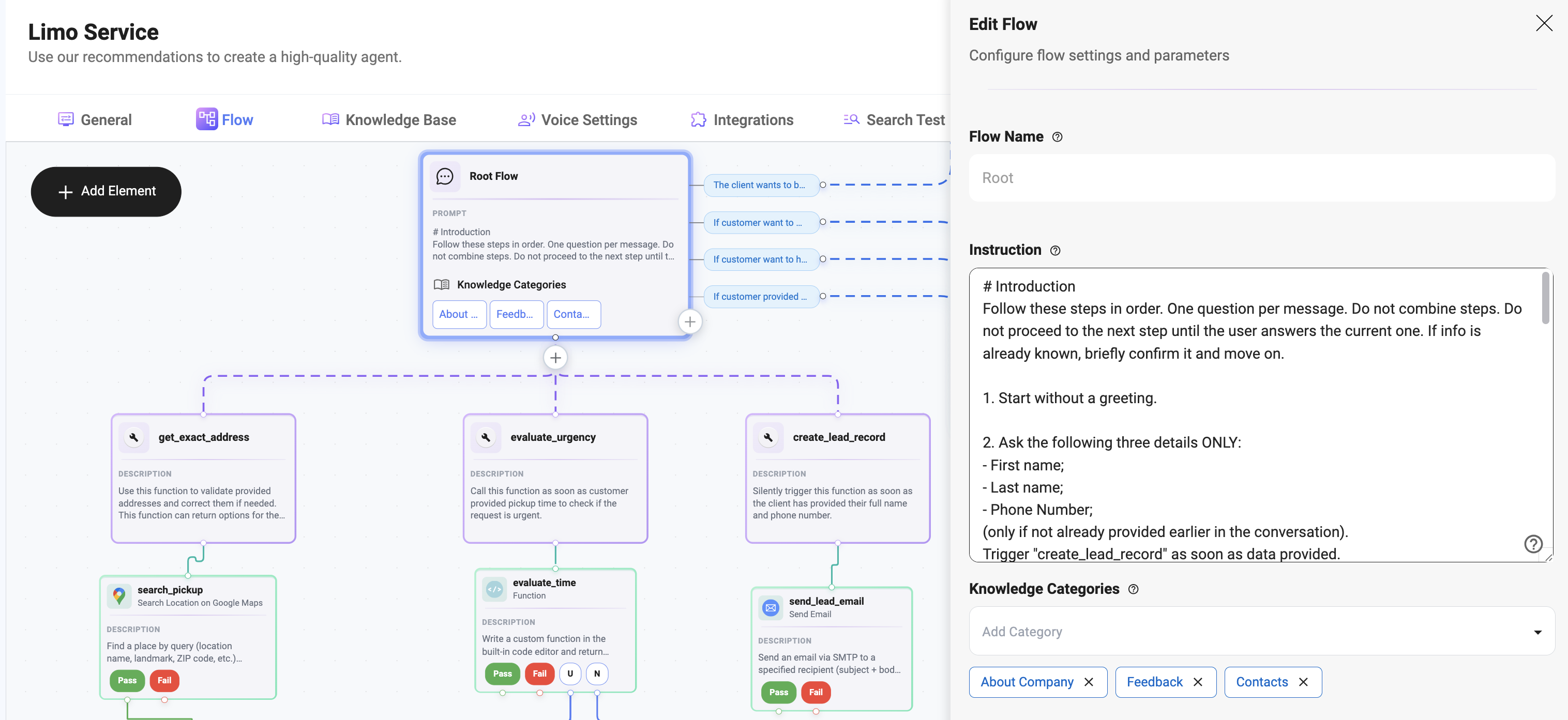 Click the + Add Element button on the canvas to create a new element in your flow. Available element types:- Node — handles conversation logic