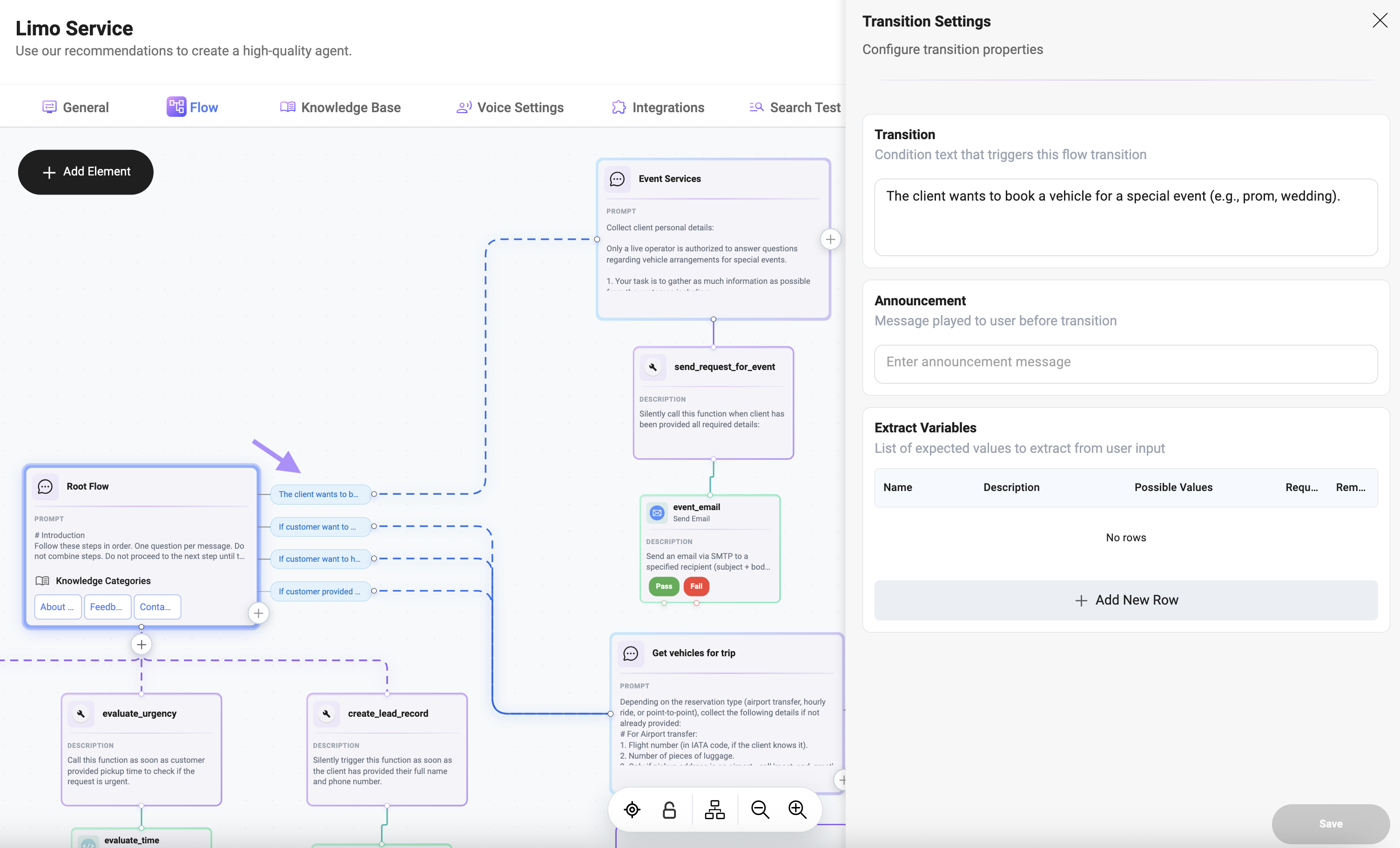 A transition is a connection between nodes that determines the next step after a node is executed. Each node can have one or multiple transitions, enabling dynamic and flexible conversation paths.Transition Settings