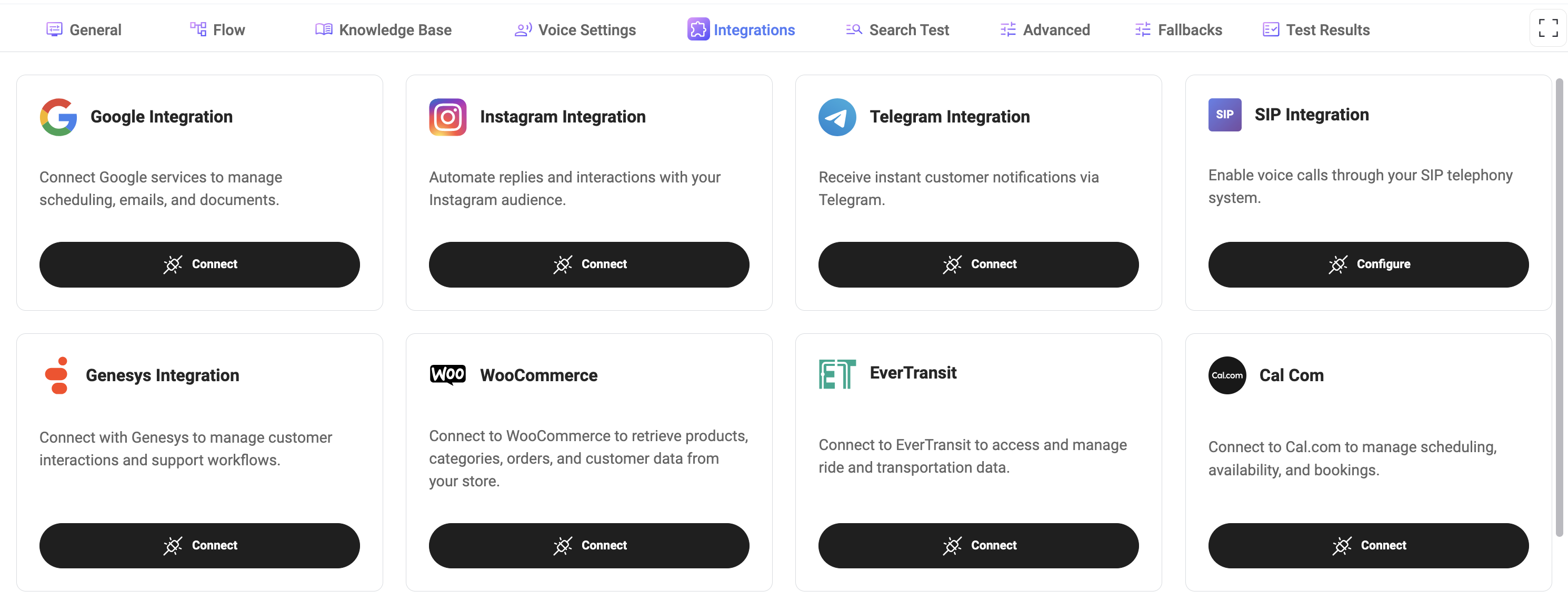 - Integrations extend the agent’s capabilities beyond basic conversations.