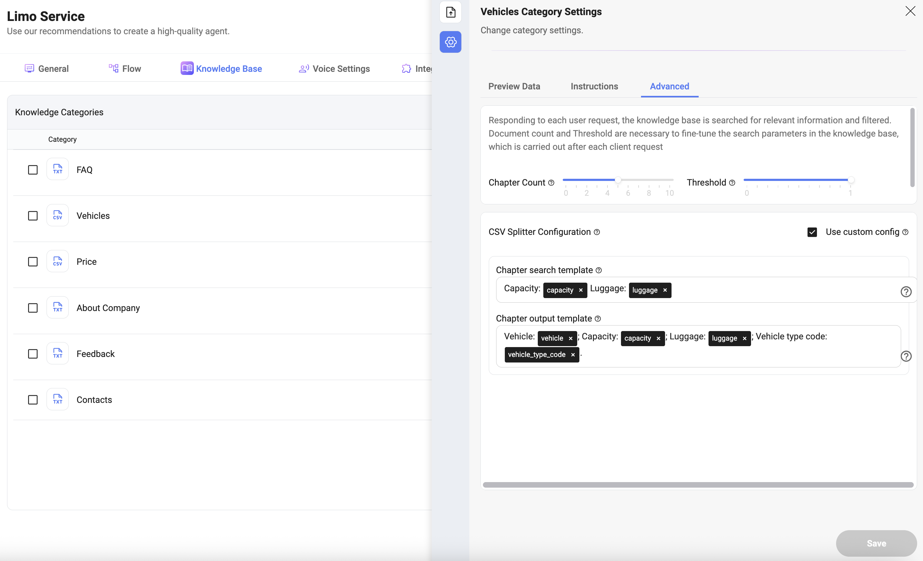 - Knowledge Categories: Organize information into separate categories (e.g., FAQ, Vehicles, Pricing).
