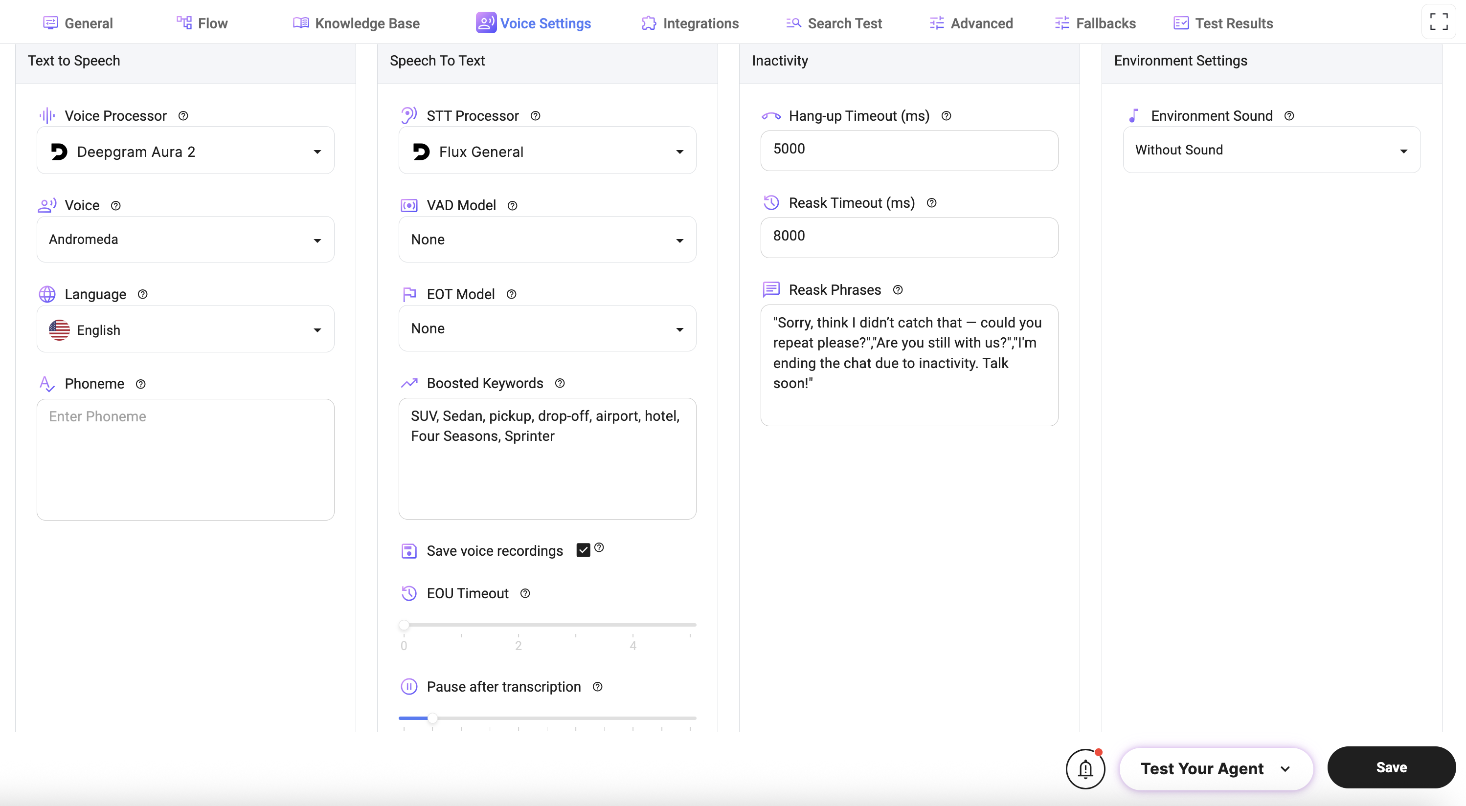 - EOU Timeout (End of Utterance): Defines how long the system waits before considering speech complete.